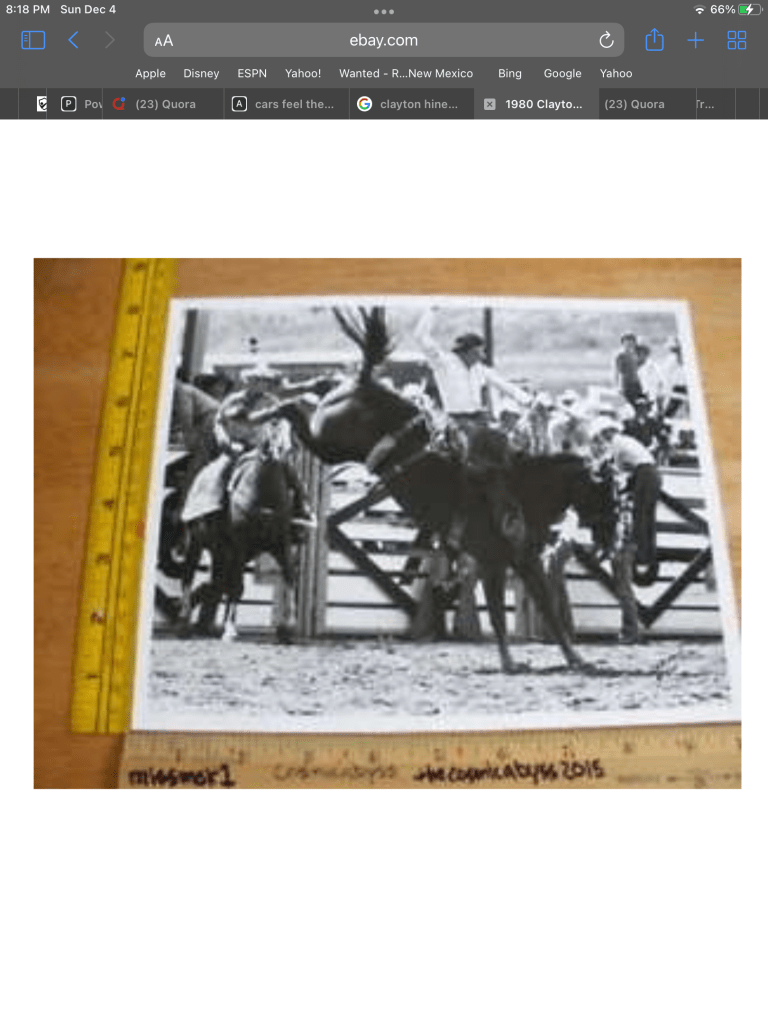 I saw lots of photos of Clayton’s Bronc riding at his place. He really turned his toes out, got way up in the neck, and handled his rein.
